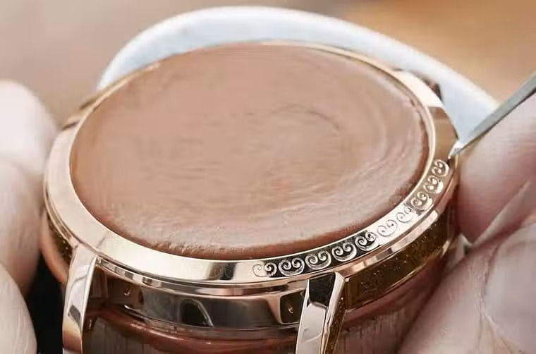 江詩丹頓先是在Traditionnelle陀飛輪的錶側、錶圈與錶耳等處以浮凸雕刻工藝刻出代表祥雲的漩渦紋路,製作過程中要先用描跡針勾勒出漩渦紋,然後再用比一般雕刻刀更尖的刀一一精細雕琢,雕出紋路後還需用霧面與亮面處理賦予祥雲圖案精緻質感,至於手錶的面盤則是先經過機刻雕花再電鍍上黑、藍或銀色。