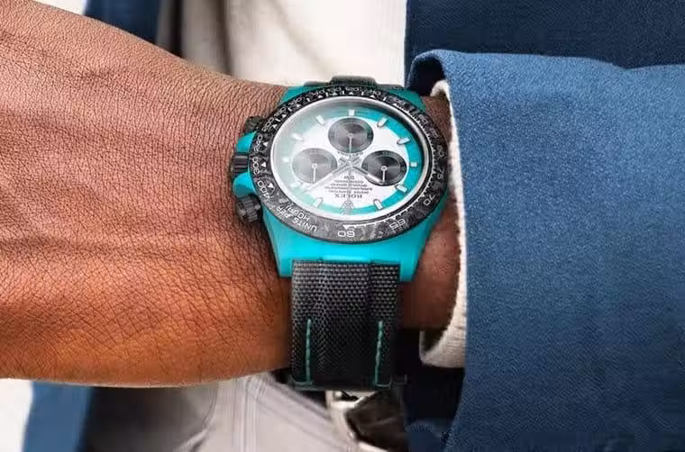 ▲錶殼顏色相當大膽亮眼的Daytona 」Celeste」佩戴在手上肯定能吸引旁人注目。Source:Designa Individual Watches