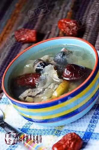 「素有「禽中黑寶」之美譽的烏雞是秋冬季的最佳滋補佳品。 烏骨雞性平、味甘;具有滋陰清熱、補肝益腎、健脾止瀉等作用。 烏骨雞用於食療,多與銀耳、黑木耳、茯苓、山藥、紅棗、冬蟲夏草、蓮子、天麻、芡實、糯米或枸杞子配伍。 此道湯加入銀耳和紅棗,與烏雞一起熬制,湯汁鮮美,營養豐富。 最適合老年人、婦女,特別是產婦食體虛血虧、肝腎不足、脾胃不健的人宜食。 尤其是冬季女性常喝烏雞湯,可滋陰養顏,益氣補血,改善手足冰涼等癥狀。」