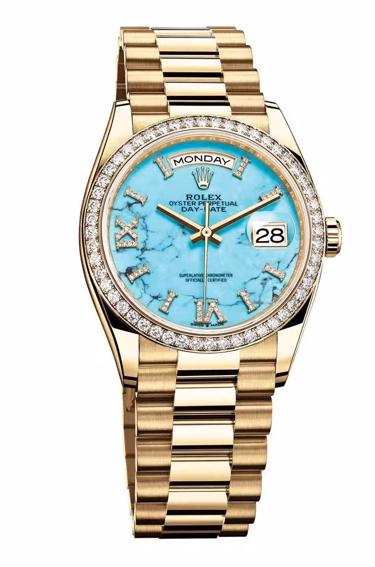 18K黃金材質/3255自動上鍊機芯/時、分、秒、日期、星期顯示/面盤鑲嵌32鑽石、錶圈鑲嵌24顆鑽石/藍寶石水晶鏡面/防水100米/錶徑36mm/參考價:NT$ 1,996,000