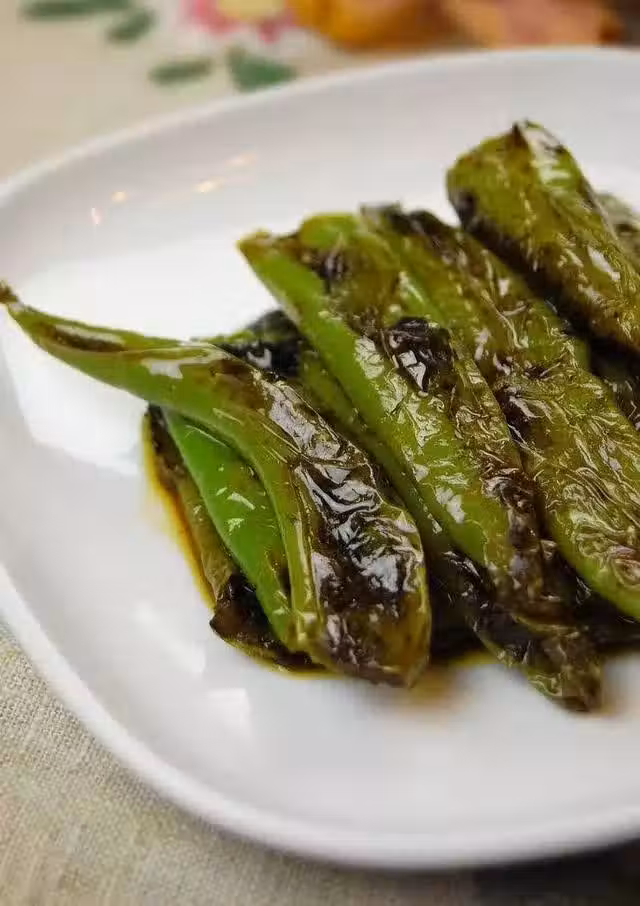 用料:尖椒8個、植物油1湯匙、蒜1瓣、白糖1小勺、食鹽1小勺、雞精少許