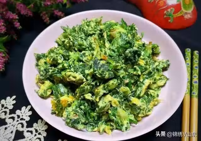 3.起鍋燒油,油熱以後,倒入薺菜雞蛋液快速翻炒均勻,炒至成形熟透後,即可出鍋開吃。
