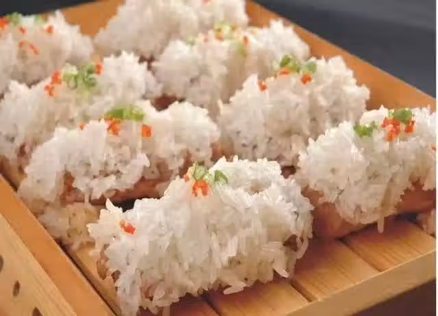 原料:糯米200克、豬小排300克、細香蔥2根、五香粉1/2茶匙、醬油1/2湯匙、蚝油1/2湯匙、料酒1湯匙、植物油1/2湯匙、食鹽1/2茶匙。