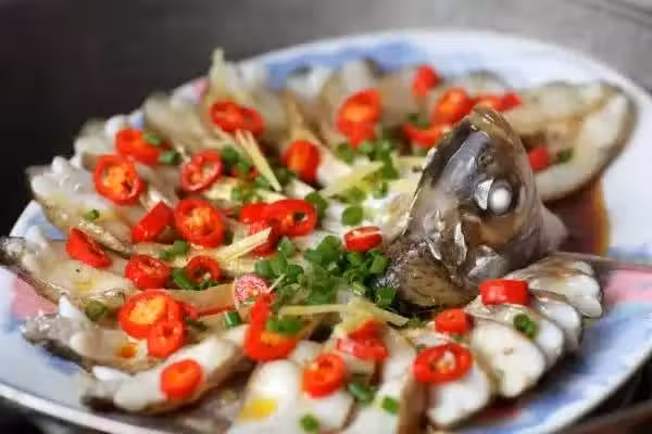 原料:武昌魚1條、紅尖椒2個、芝麻油20克、小蔥20克、蒜泥10克、姜10克、白鬍椒適量、料酒15克、食鹽1小勺、醋30克、雞精半小勺、蒸魚豉油20克