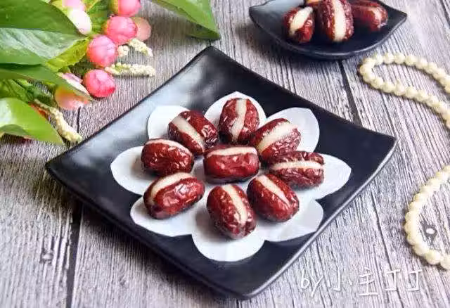 這款紅棗很甜,所以不放糖;如果不甜的紅棗根據口味可以放糖或淋上蜂蜜。取紅棗核時,先用刀剖開,再用剪刀在棗核底剪一下,再夾住棗核拽出來。
