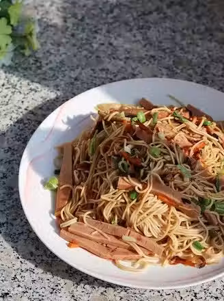 火腿、義大利細面、圓白菜、雞蛋、蒜、生抽、陳醋