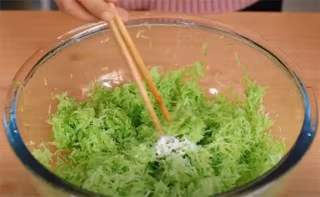 3.等蘿蔔絲不燙手的時候,我們加上一勺的食鹽,鹼面的話我們放上一點點就夠了,來保持它翠綠的顏色。