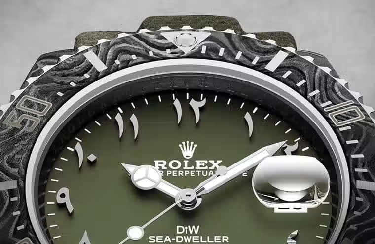 除了時標改成少見的字體,面盤顏色也呼應錶帶與錶圈上數字換成了軍綠色,至於12點方向與6點方向的品牌與系列名稱等字樣則是一律採白色,在綠色面盤下顯得格外清新易看。改裝錶品牌用綠色詮釋「獵人」平時走跳的叢林環境,要說它帶點軍風感也沒有不妥,在中東面與碳纖維錶殼兩大改造特徵的助威下,手錶因此煥然一新,也瞬間提升到43,990歐元這樣的改裝行情價水準,比起原廠的126600定價要高出不少。