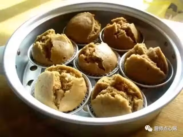 3、蒸鍋預熱至水開後,將做法2的麵糊倒入紙模中,放入蒸籠中蒸約20分鐘左右即可取出。