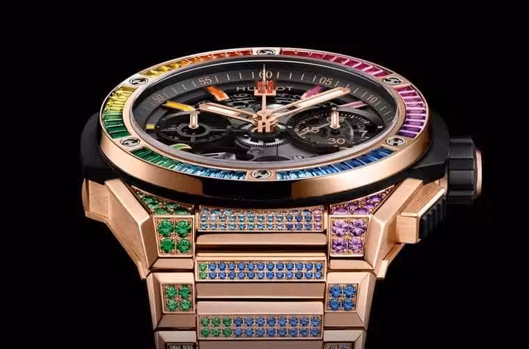 ▲宇舶於兩款皇金錶殼的Big Bang Integrated手錶上,結合彩色寶石鑲嵌元素,呈現華麗繽紛視覺效果。