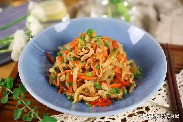 第二步:胡蘿蔔洗凈切絲,燈籠椒洗凈切絲,瘦肉洗凈切絲,榨菜洗凈切絲,蒜瓣拍碎,瘦肉放玉米澱粉,料酒,生抽抓勻腌制10分鐘,鍋下油燒熱,肉絲下鍋炒至變色撈起