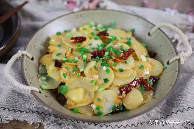 第三步:鍋里下油燒熱,放干辣椒和蒜米下鍋爆香,放土豆片下鍋翻炒至透明,調入鹽和糖,調入醬油拌均勻,最後撒上蔥花起鍋裝盤