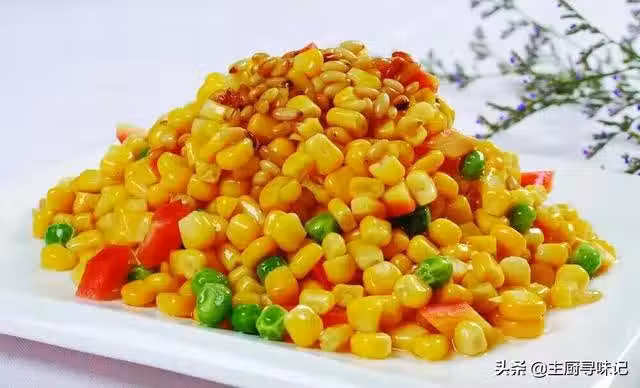 第二步:鍋入適量色拉油,下入玉米粒,加入鹽和糖翻炒。最後加入黃瓜丁、紅椒丁和松子仁炒勻後出鍋裝盤。