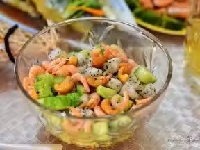 蝦仁,小黃瓜,火龍果,腰果,沙拉汁,亞麻籽油