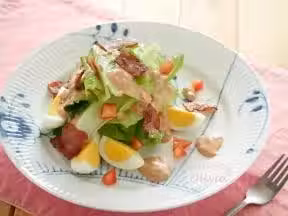 3 生菜疊在盤中,放上番茄丁、水煮蛋和培根,淋上千島醬即可。