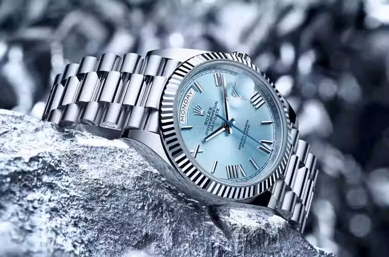 ROLEX勞力士Day-Date問世後不久被美國總統詹森Lyndon Baines Johnson相中佩戴,巧合的是勞力士當年幫手錶設計的錶帶就稱為"President"錶帶,這也讓品牌在1960年代的廣告中首度以"President's Watch」來代稱Day-Date手錶,此後這款錶便成了大家耳熟能詳的總統錶,直到今天依舊深受各界名流喜愛。 此系列2022年有個不起眼的變化在於品牌取消了拋光錶圈設計,這使得「總統錶」目前只剩下三角坑紋錶圈和鑲鑽錶圈兩種選擇,而品牌今年似乎頗為著重Day-Date系列的鉑金款式,例如他們就發表了採用冰藍面的新作228236。