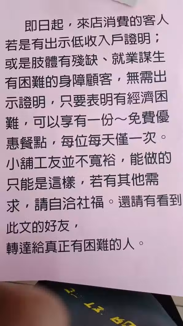 也有網友建議:「可以跟社福團體合作,製作待用餐券,給有需要的人。」、「老殘窮不便出門,跟華山基金會的愛心站配合看看。」林老闆稍早也在臉書解釋,未來規則照舊,不看任何低收證明、殘障手冊「我只問他(她),是不是真的有困難?只要回答是,我就供餐。」他知道,有些人確實困難,卻不符低收資格。這份善心,他還是要堅持下去~