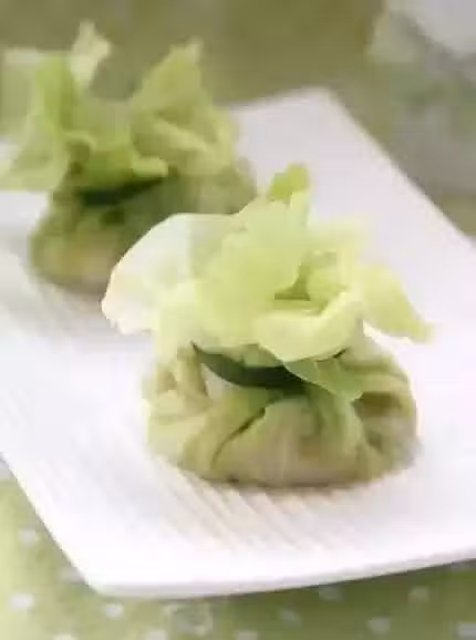 1. 圓白菜葉洗凈,入沸水中燙軟;蝦仁去泥腸,洗凈,用食鹽和薑汁腌制10分鐘;香菇去蒂,洗凈,切碎丁,入沸水中焯燙半分鐘。