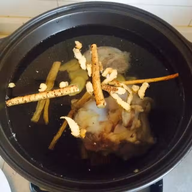 將洗凈的牛骨放入砂鍋,放黃芪、黨參、當歸、花旗參和薑片