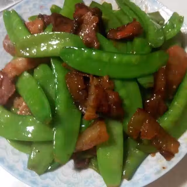 腊味(臘肉,臘腸)250g;荷蘭豆500g;油,鹽,糖,生粉適量