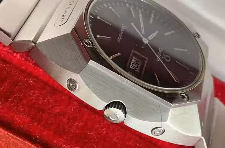Seamaster Mariner 1的錶殼尺寸為41.5x38.5mm,在當時可是屬於手錶中的大塊頭,而且它的厚度達到11.5mm也和現代石英錶的薄型印象有所出入。這款錶擁有富有切角的獨特輪廓,除了八角造型錶圈,下方錶耳特別鑲上一塊刻有歐米茄Logo和QUARTZ字樣的銘牌,並搭配單鍊節組成的鍊帶隱隱跟上當時正要冒出頭的高級運動錶熱潮;而在錶冠兩側會看到兩枚隱藏式按把,你可能直覺會想到大概是用來快調日期和星期顯示之用,其實並不盡然如此,在錶冠上方的那枚按把竟然是用來調校秒針用的,夠特別吧!雖然1310機芯沒有經過天文台認證,但它每個月月差僅5秒的水準也是夠驚人的了,為了維持手錶傲人的顯時品質,因此歐米茄才會這是秒針快調按把,讓佩戴者可以一秒一秒校正手錶;至於錶冠下方的按把則是用來快調日期。