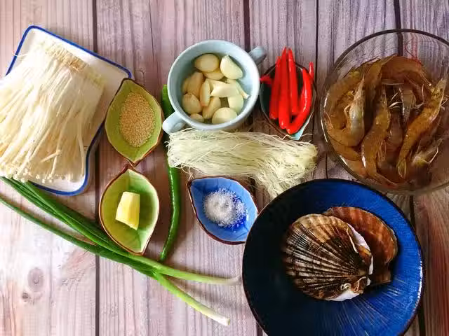 4、粉絲入開水中泡2分鐘瀝干水份,入鹽、蒸魚豉油、蒜蓉油少許碼味,把粉絲打圈墊在扇貝肉底部。