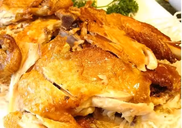將雞摘洗乾淨,去骨,抹上鹽、料酒、醬油,過油炸熟再用筷子挑起離油,用勺子舀起熱油反覆澆雞身上,澆至雞皮燙焦改切小塊,吃時蘸花椒鹽。