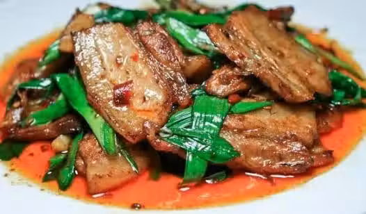 鍋加油燒熱放入五花肉煸炒,炒至肉微卷加蔥薑片炒香加郫縣豆瓣醬,甜麵醬在繼續煸炒一會加料酒,青蒜炒一會即好