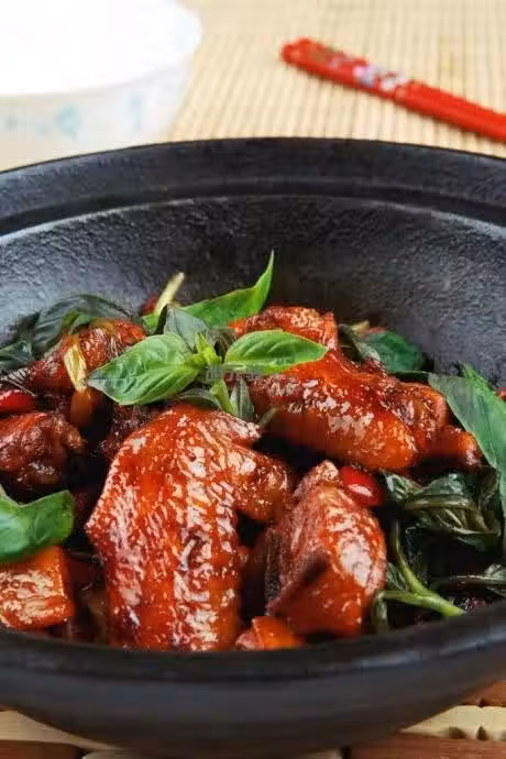 現在,煲仔爐關火,將炒鍋中的所有食材倒入煲仔中,快速倒入三茶匙香油,在聽到刺的一聲響後,放入九層塔,並且蓋上煲仔的蓋子,繼續燜它20秒中,上桌