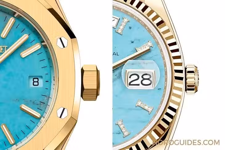 ■ 日曆窗 愛彼的日期窗呈最簡簡單單的長方形,沒有任何邊框鑲嵌或用以刻意凸顯出日期窗的斜角,座落在3時位置,特意選用與綠松石同色調的底色搭配黑色字體來呈現,通過最低程度的存在感,帶出與錶盤融為一體的效果。勞力士的長方形日期窗飾以18K黃金邊框,白底黑字,與星期窗的配置相互呼應。就如同勞力士其他具備日期窗的表款一樣,日期窗上方加添了小窗凸透鏡來帶出放大效果,大大提升了閱讀時間的便易性。