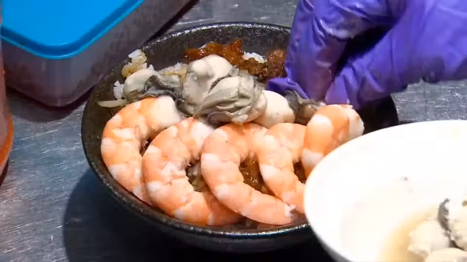 一碗白飯加上滷肉,以為這樣就沒了嗎,錯錯錯,最後再加上滿滿的蚵仔,一個、兩個、三個,直到整碗都變成一座蚵仔山丘了,老闆還在放,簡直是把蚵仔當作不用錢,另外還有這碗,同樣是滷肉飯做為基底,先放上五隻剝好的蝦,中間放上滿滿的蚵仔,最後再加上滿滿的魚卵,這碗海鮮肉燥飯就完成了,讓饕客們看到就口水直流,就連外國人都特地來訪,可見這碗蚵仔滷肉飯的魅力,香港客人:「我是從香港來的,就是在IG上看到,然後我挺喜歡吃海鮮的,就來試一試。」
