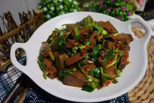 4. 加入鴨血翻炒勻,加入鹽,放入韭菜,炒至韭菜變色後即可關火。