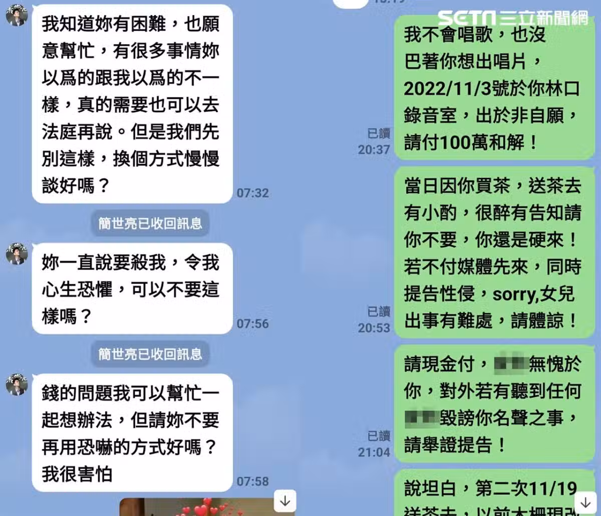 A女進一步說,荒山亮知道她在桃園沒有朋友,所以就說可以把他當成哥哥,誰知道在付出信任之後,卻換來對方:「妳可以把我當哥哥」、「沒關係哥哥疼一下,我會小力一點!」雖然拒絕但還是遭到下手,她也坦言,在那之後因為家裡需要用錢,因此談判後要求付100萬元和解金,而荒山亮從此不讀不回,只給了1萬元還嗆聲:「有本事妳告我啊,妳去告我啊!」讓她心寒不已。