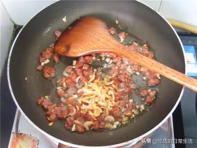 3、這時,加入芋頭丁翻炒幾下,再放入一些胡椒粉2g、5g食鹽、生抽5g、2g雞精來調味兒,翻炒3分鐘就差不多了,拿到一邊放涼。