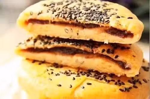 7.在案板上均勻地撒上一層熟芝麻,將小圓餅放在芝麻上輕輕地按壓,使之兩面都沾上芝麻