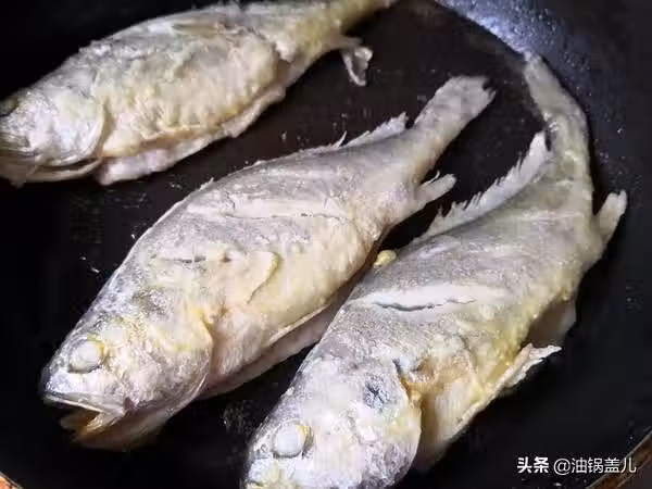 6、此外,在煎制的過程中不要來回翻動,要等靠著鍋底的那一面煎熟後,再翻到另一面。如果頻繁的翻動黃花魚,黃花魚的魚皮很容易粘在鍋上,影響到菜品的美觀。等到黃花魚兩面都呈現金黃色,就可以將黃花魚裝盤了。
