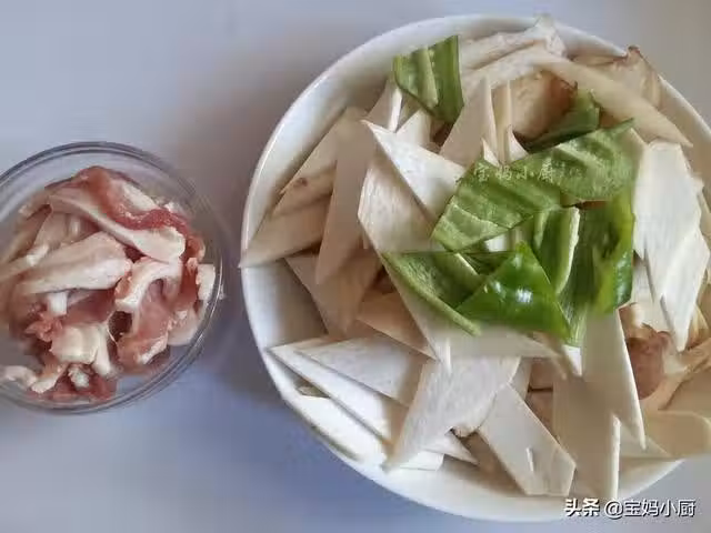 2 杏鮑菇切菱形片;尖椒切片;五花肉切片;大蒜去皮拍扁切末
