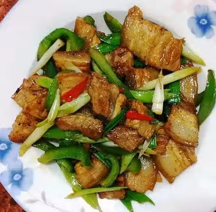 2、起鍋入油,油熱放入五花肉過油片刻後撈起,剩油倒出留少許油在鍋內,放入拍碎的蒜頭爆黃,放入五花肉,依次放入青椒紅辣椒、青蒜、調料,翻炒3分鐘左右,放入青蒜,翻炒片刻即可裝盤。