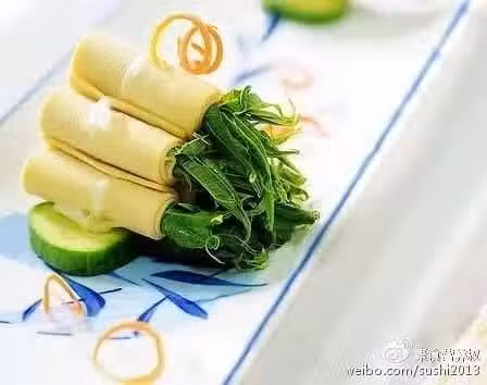 4、將椿芽放在豆皮上,從一側捲起,捲好後紮緊製作完成。