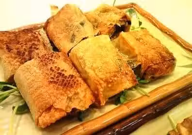 7、不粘鍋下油,油熱,放入腐皮卷煎至腐皮卷要用小火慢慢煎至兩面微黃即好。