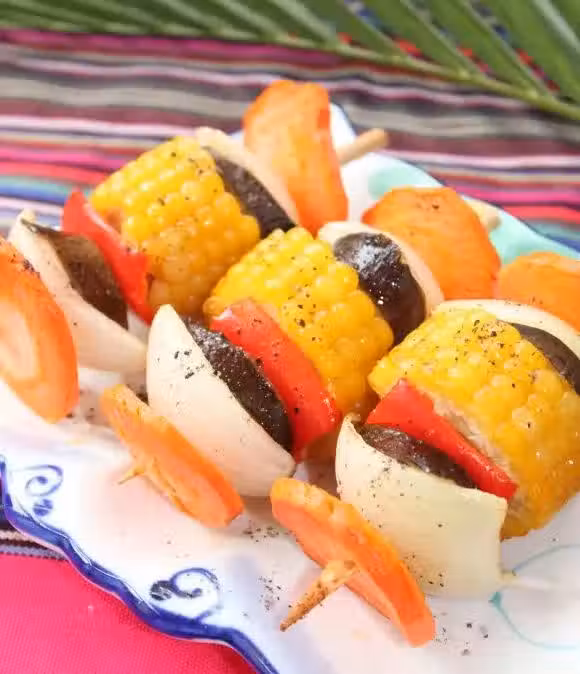 4、把茄子片、胡蘿蔔片、紅椒塊、土豆塊、玉米段串在竹籤上,刷上融化的椰子油。