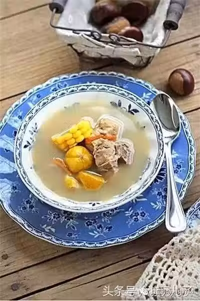 4.沙煲中放入脊骨、板栗、甜玉米、陳皮和薑片,倒入足量清水沒過食材,大火燒開後轉小火慢燉1個半小時,喝的時候加鹽調味即可。