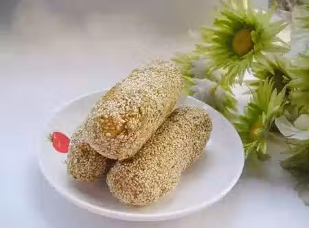 2、「麻棗」的餡一般採用烏豆沙,用皮包成棗形,外面滾上白芝麻,放入五成熱的油鍋中炸至金黃色即可。