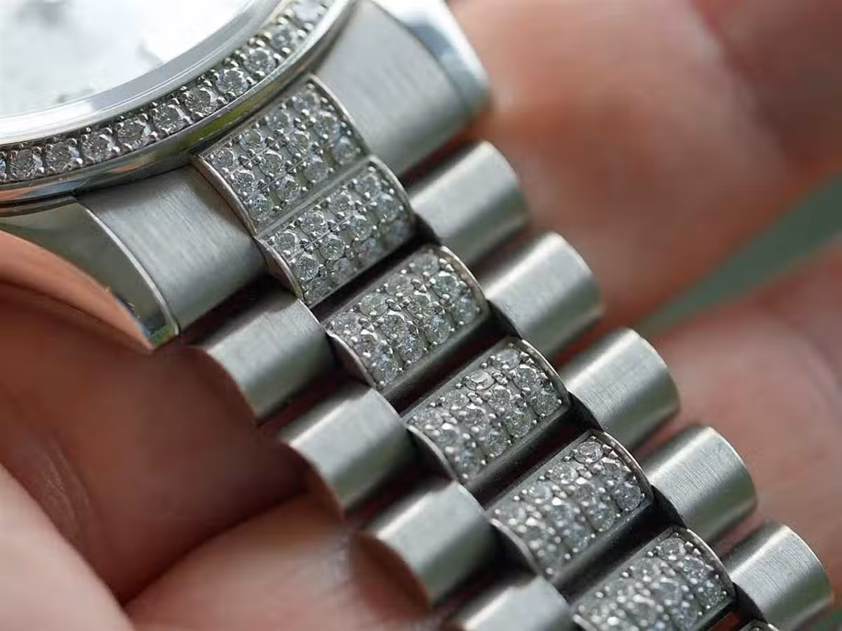 可以看到每一節元首帶中間的帶節鑲嵌三層方鉆,均勻排列在一起,不難想像這表戴在手腕上,一抬手鉆石的閃耀亮瞎眼睛的場景。這種亮閃閃的效果,簡直豪氣沖天。