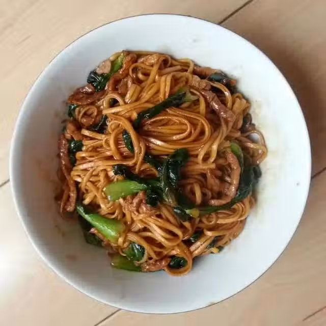 4、炒鍋燒熱,入油,下肉絲煸炒,再入青菜炒軟,下入麵條,再將小碗里的汁倒入拌勻即可出鍋