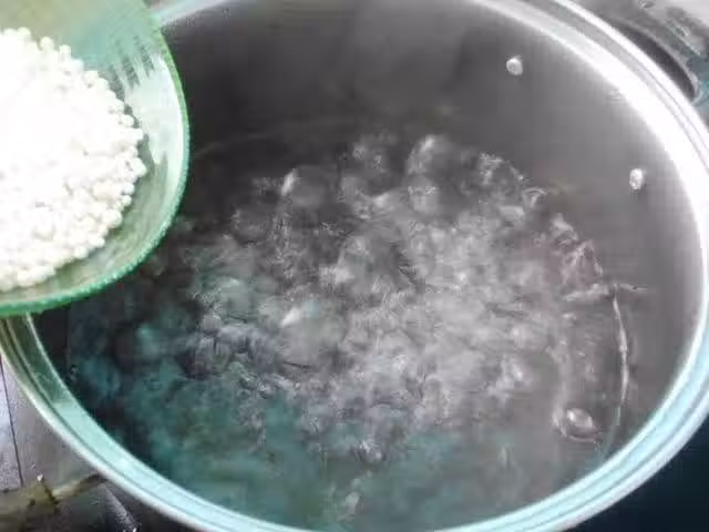 2、一定等水徹底煮至沸騰之後,才能把西米放入,這樣西米隨著水波散開時不容易黏在一起,煮的時候一般開小火就可以,煮的過程中,要不時地攪拌,不然會很容易糊鍋。