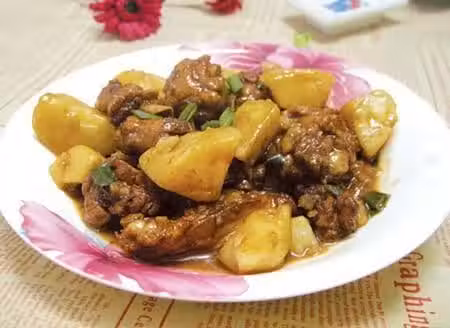 雞腿6個;小土豆4個;油;薑片;八角;醬油;料酒