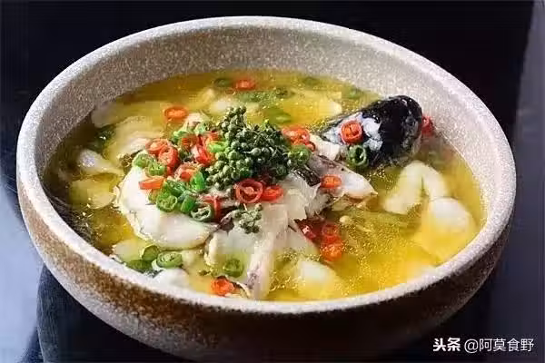 4、鍋內放少許色拉油燒熱,下魚頭和魚骨煸香,摻入自製酸湯,|水手美食|調入雞精、味精、白醋和酸辣鮮露,燒開後下碼味的魚片滑熟,撇去浮沫。撈出魚頭、魚骨和魚片,鋪在墊有青筍絲和金針菇的盤中,再倒入適量煮魚湯汁。