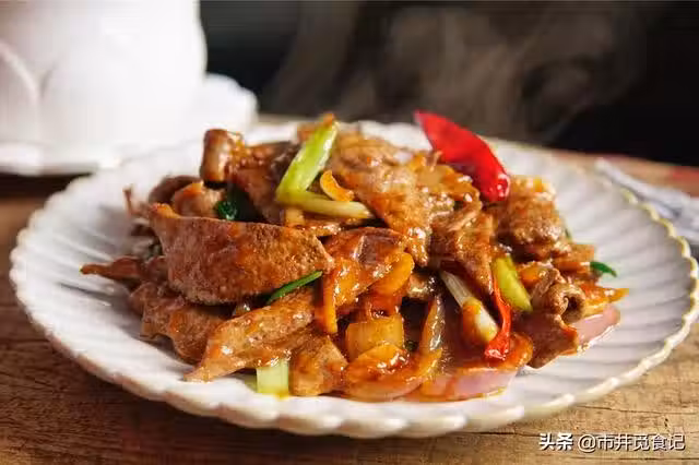 3、鍋內少許底油,加薑絲,蒜瓣,干辣椒爆香鍋底。倒入洋蔥煸炒片刻出香味,加入炸好的豬肝片,加入2勺醬油翻炒1分鐘,1勺蚝油,少量的鹽和糖調味,倒入小蔥段大火翻炒2分鐘。