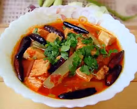 食材:凍豆腐200g、油適量、鹽適量、豆瓣醬適量、生薑適量、大蒜適量、番茄適量、豬肉末適量、白糖適量